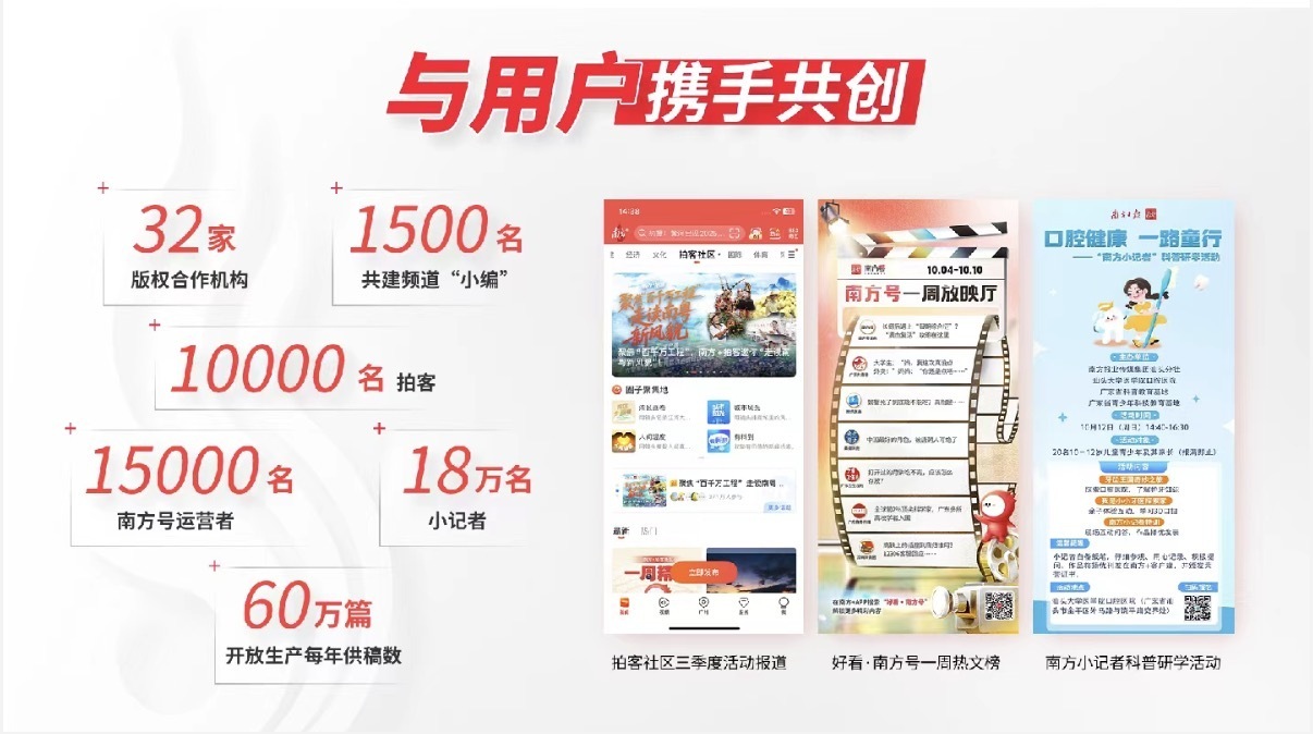 我们与用户共创,激活内容活力。1500名共建频道“小编”、1万名拍客、1.5万名南方号运营者、2.5万名应急信息联络员、18万名小记者汇聚于南方+,通过报料、供稿等形式参与内容创作。如今,开放生产每年供稿约数十万篇,为南方+内容池注入源源不断的生命力。