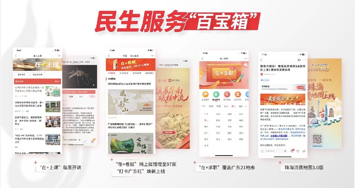十年间,南方+建成“省市县镇村”五级传播网,不断拓展“新闻+”服务版图,提升用户使用体验。“媒体赋能工具箱”持续扩容,累计上线AI辅助创作、投票互动、线索征稿、活动打卡、知识答题、便民查询、在线缴费等上百款服务工具,真正为用户实现“在+办”;与“粤系列”服务深度联动,用户可从南方+一键进入“粤省事”“粤健通”“粤税通”“粤医保”等平台,实现“看新闻、办政事”无缝衔接;“+游广东”“食在广东”“在+帮办”“在 +上课”“在+求职”“在+看展”“在+寻医”等服务模块不断优化,满足用户多元需求。