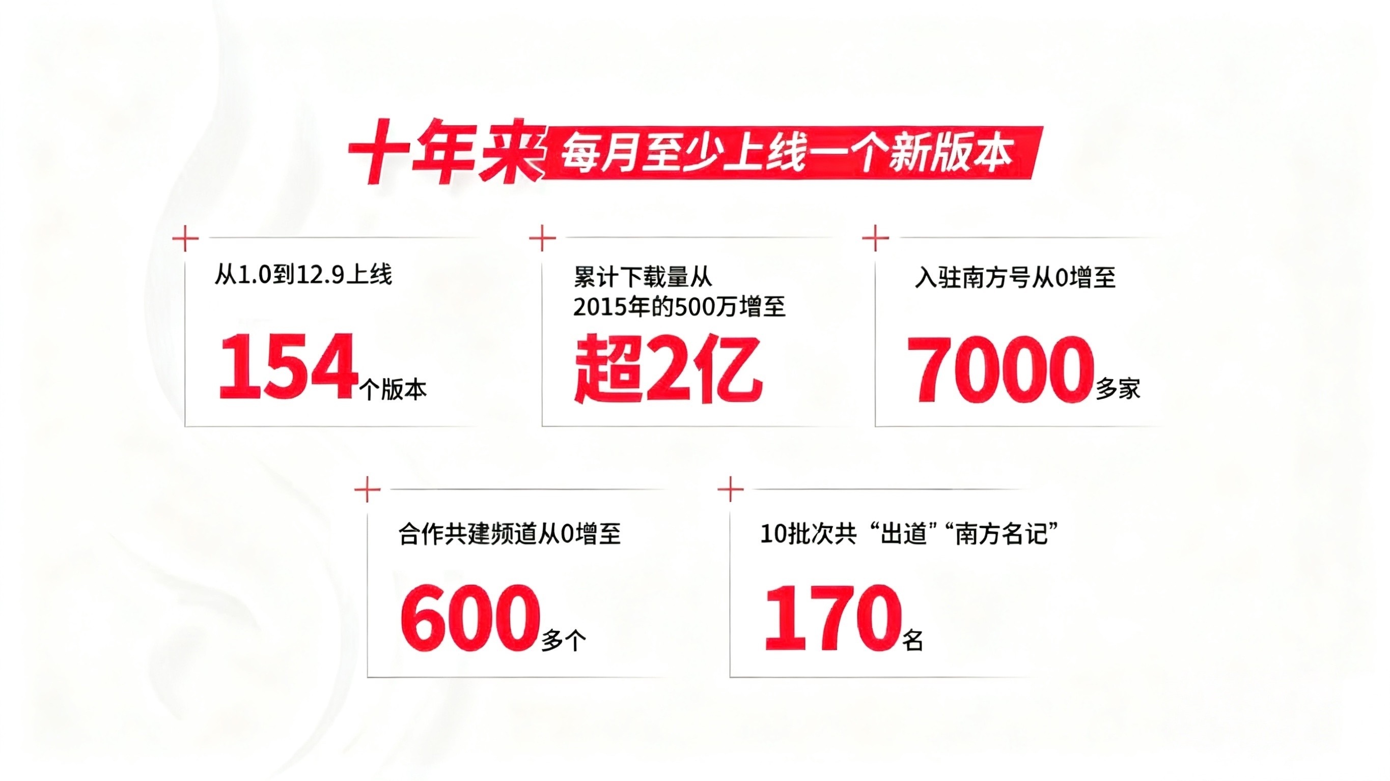 十年间,从1.0到12.9,南方+迭代了154个版本,相当于不到一个月就上线一个新的南方+。累计下载量从2015年底的500万增加到如今的超2亿;政务新媒体矩阵“南方号”从0增至7000多家,覆盖广东“省市县镇村”五级区域、20多个垂直领域;共建频道从0增至600多个,遍布全省21地市、上百个区县。